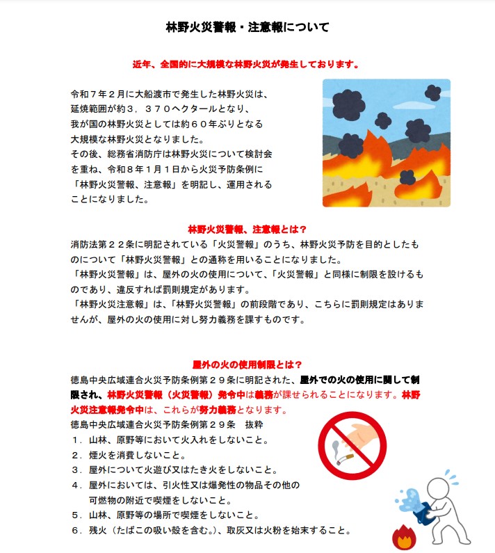 徳島中央広域連合火災予防条例が改正となり、令和8年1月1日から林野火災警報・注意報が運用されることとなりました。